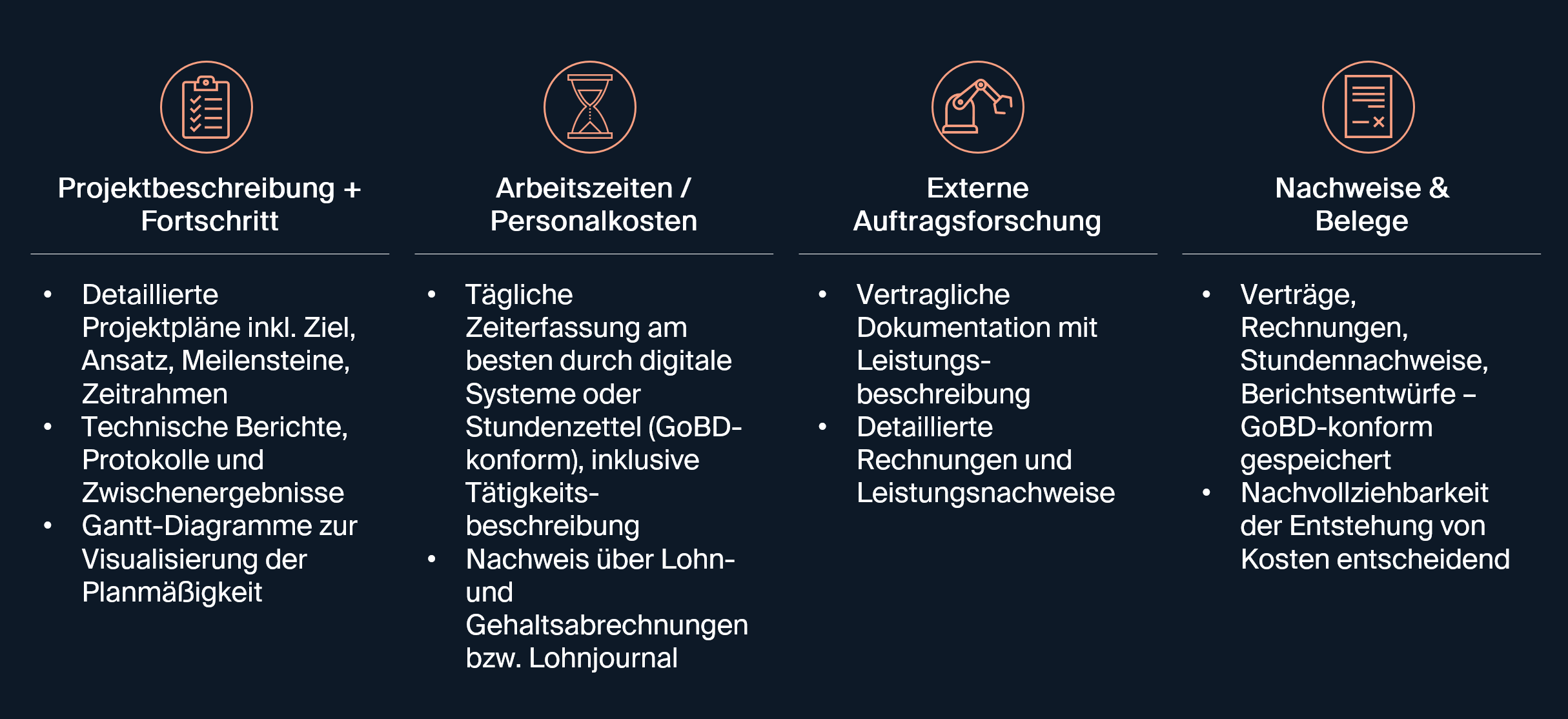 Die Forschungszulage ist ein wirkungsvolles Instrument, um Forschung und Entwicklung (FuE) in Deutschland steuerlich zu fördern. Damit Unternehmen die Förderung erhalten, müssen sie ihre FuE-Aktivitäten und Kosten lückenlos dokumentieren. Die Dokumentation ist nicht nur für die Antragstellung bei der Bescheinigungsstelle Forschungszulage (BSFZ) entscheidend, sondern auch für die Prüfung durch das Finanzamt.